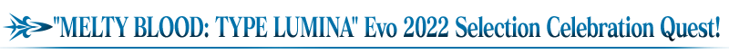 * Please note that "'MELTY BLOOD: TYPE LUMINA' Evo 2022 Selection Celebration Quest" is a battle only quest. * Quest data will be downloaded when the quest is started. * Please note the featured video will not be available for playback in Materials. * Please be aware of carrier data limits if not connected to Wi-Fi when playing. * Depending on your sound settings, part of the video may be played at a loud volume. Please check your sound settings before enjoying the video.