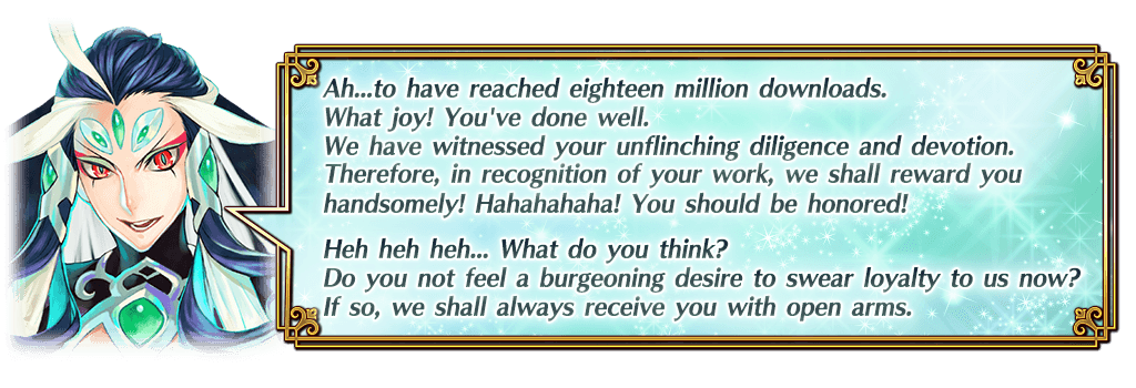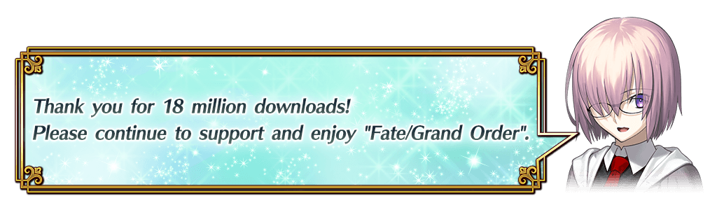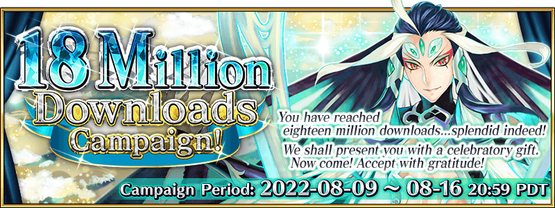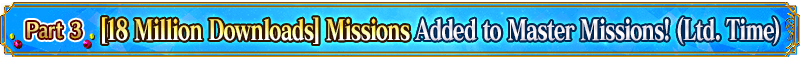 *Please note that the Campaign Period and Rewards Claimable Period are not the same. * This mission is separate from the weekly Master Missions that are updated every Sunday at 17:00 PDT. If you do not claim the rewards by the end of the Rewards Claimable period listed above, they will no longer be available. * "[18 Million Download] Missions" will not be counted towards weekly Master Mission progress. * Depending on your Main Quest progress, it may not be possible to complete the "[18 Million Download] Missions".