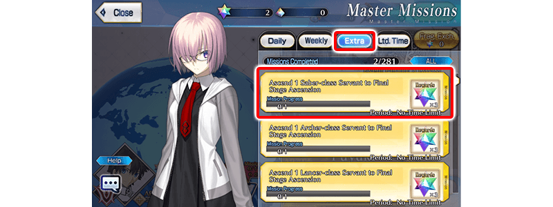 Servant Ascension missions will be displayed within the "Extra" tab on the Master Mission screen. Tap a mission marked "Can Be Claimed" to receive the reward.