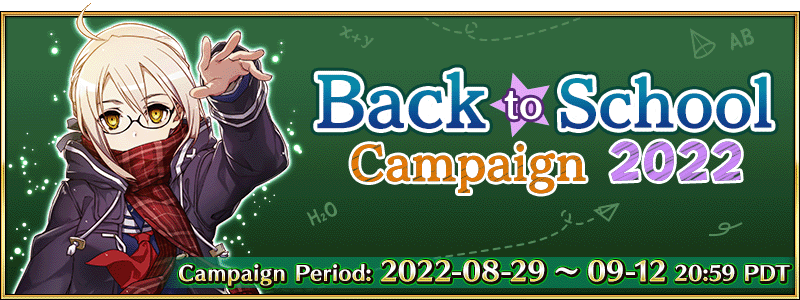 During the campaign period, Rank Up Quests and Interludes for Servants related to the "Back to School Campaign 2022" will have their AP costs halved! (AP costs will not change even if you withdraw from battle).