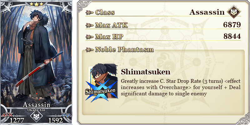 | 2022-09-04 21:00 - 09-06 20:59 PDT | ★3 Okada Izo | ★5 Okita Souji (Saber) |