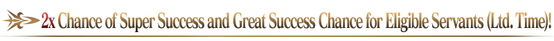 Servants related to "Fate/Grand Order THE STAGE - The Grand Temple of Time: Solomon Ars Nova" will have a double chance of Super Success (double EXP received) and Great Success (triple EXP received) when performing Enhancement during the period below!