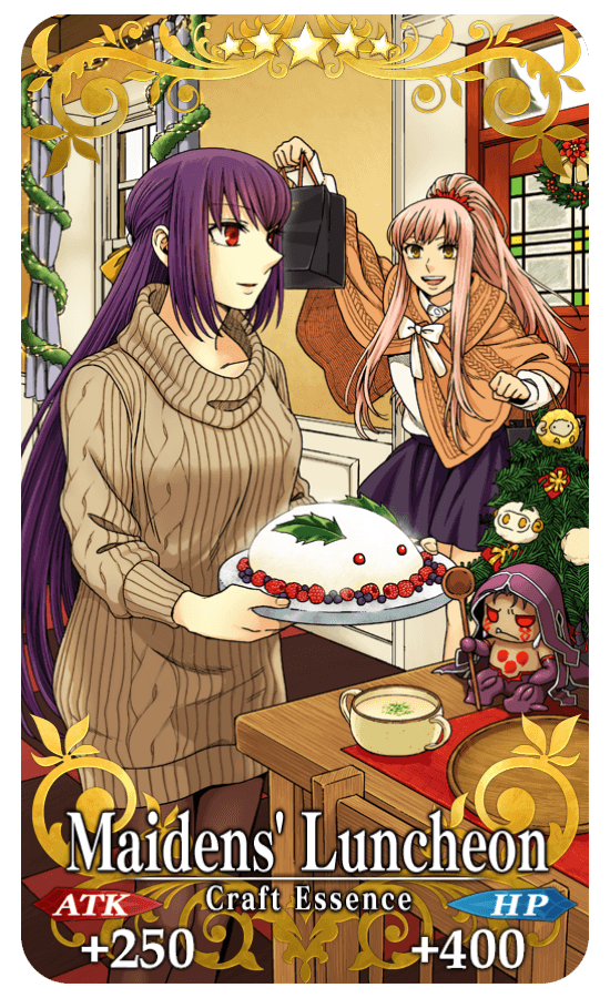 ★★★★★SSR Maidens' Luncheon ATK 250 (MAX: 1000) HP 400 (MAX: 1600) Skill Increase NP Gain by 20% & NP Strength by 20% for yourself + Increase amount of Pillow of Devotion per drop by 1 [Event Only]