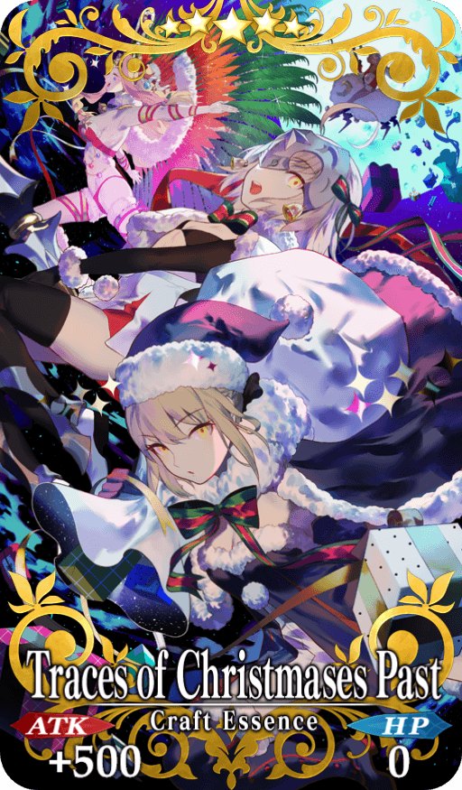 ★★★★★SSR Traces of Christmases Past ATK 500 (MAX: 2000) HP 0 Skill Increase your Quick Card effectiveness by 8% & NP Gain by 8% & begin battle with NP charged at 30% for yourself + Increase amount of Bandage of the Holy Night per drop by 1 [Event Only]