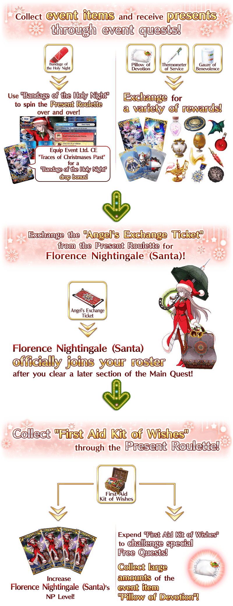 * Angel's Exchange Ticket can be exchanged for "★4 (SR) Florence Nightingale (Santa)" through Event Item Exchange once you have cleared Section 6 of the event story.