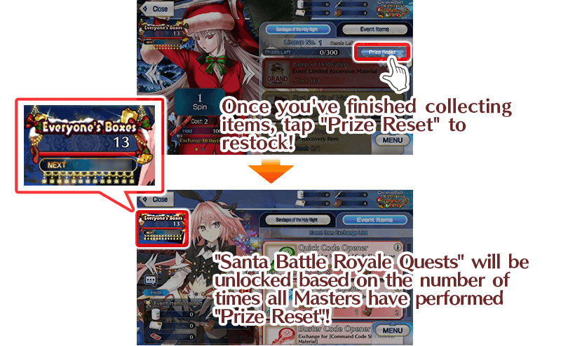 "Everyone's Boxes" records the number of times all Masters have performed "Prize Reset". When it reaches a certain level, a "Santa Battle Royale Quest" will be unlocked!
