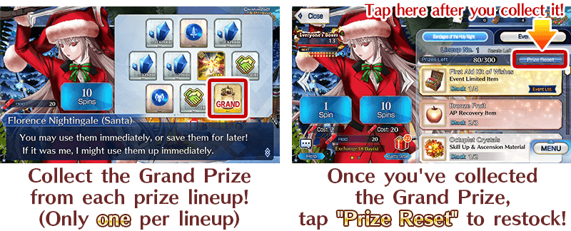 * As this is a Revival - Lite event, "Prize Reset" will be available only nine times, after which it will no longer be possible to reset the Present Lineup again. * Event item "First Aid Kit of Wishes", included in each Present Lineup, can be exchanged for "Florence Nightingale (Santa) [For NP Enhancement]", various materials, or to challenge special Free Quests. * "Bandage of the Holy Night" can be exchanged for "First Aid Kit of Wishes" or QP. * "Bandage of the Holy Night" will disappear at the end of the Exchange Period.