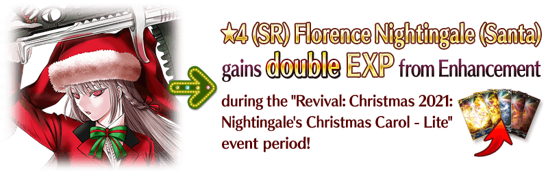 For the duration of the event period, "★4 (SR) Florence Nightingale (Santa)" will receive double EXP when performing Enhancement.