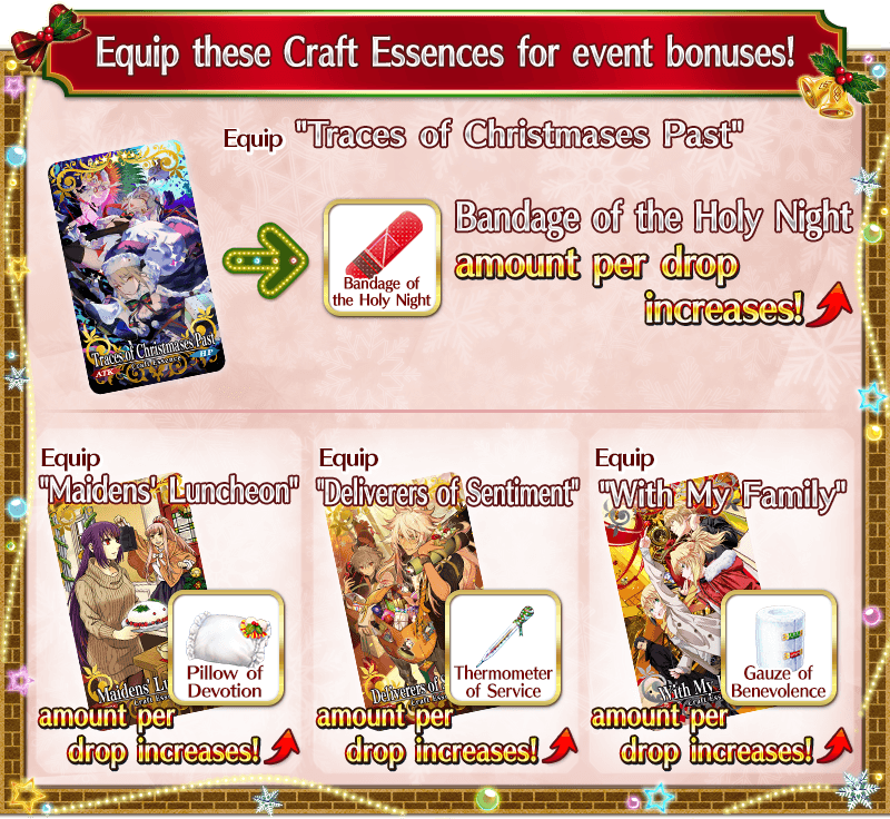 Equip the Event Limited Craft Essence "★5 (SSR) Traces of Christmases Past", available through Event Item Exchange, to receive a bonus to the amount per drop of event item "Bandage of the Holy Night".