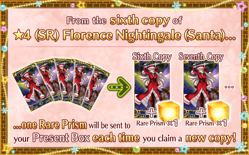 Once you have acquired a total of six copies of "★4 (SR) Florence Nightingale (Santa)", one Rare Prism will be awarded for each new copy, beginning with the sixth.
