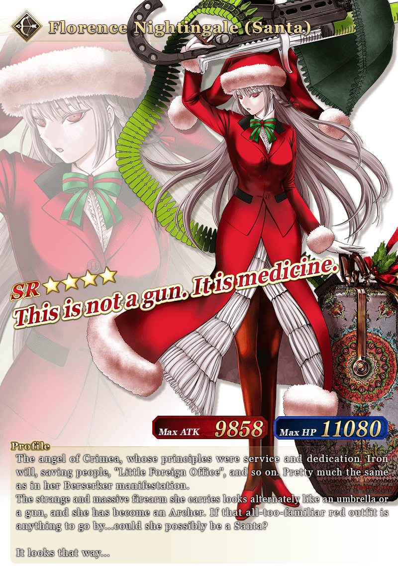 See "★4 (SR) Florence Nightingale (Santa)" in action on YouTube, where we're sharing an exclusive video of her Noble Phantasm!