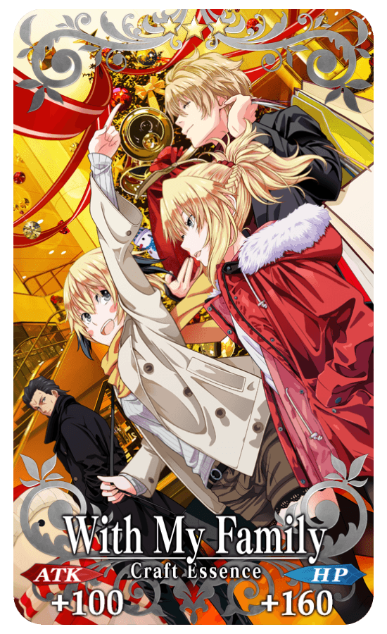 ★★★R With My Family ATK 100 (MAX: 500) HP 160 (MAX: 800) Skill Gain 1 C. Star each turn & increase your Buster Card effectiveness by 3% + Increase amount of Gauze of Benevolence per drop by 1 [Event Only]