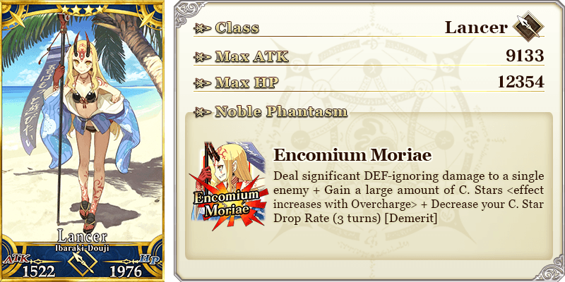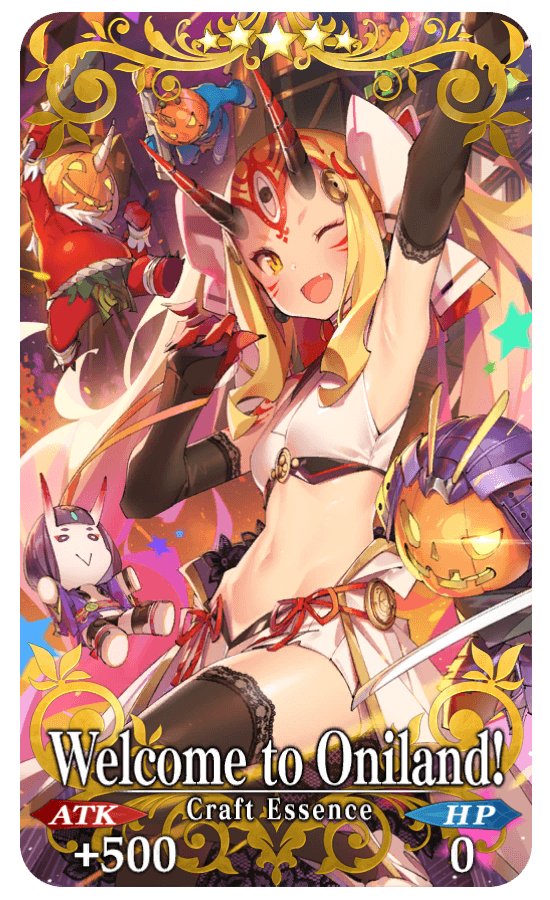 ★★★★★SSR Welcome to Oniland! ATK 500 (MAX: 2000) HP 0 Skill Increase Arts Card effectiveness by 10% & Buster Card Effectiveness by 10% & begin battle with NP charged at 40% |
