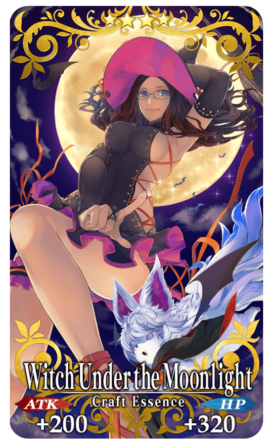 ★★★★SR Witch Under the Moonlight ATK 200 (MAX: 750) HP 320 (MAX: 1200) Skill Increase Arts Card effectiveness by 10% & NP Gain by 5% for yourself |