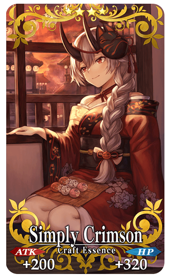 ★★★★SR Simply Crimson ATK 200 (MAX: 750) HP 320 (MAX: 1200) Skill Increase Buster Card effectiveness by 8% & Critical Strength by 8% & NP Gain by 8% for yourself |