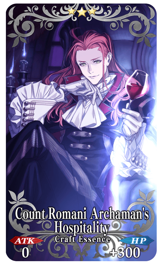★★★R Count Romani Archaman's Hospitality ATK 0 HP 300 (MAX: 1500) Skill Increase NP Gain by 5% & DEF by 3% for yourself |