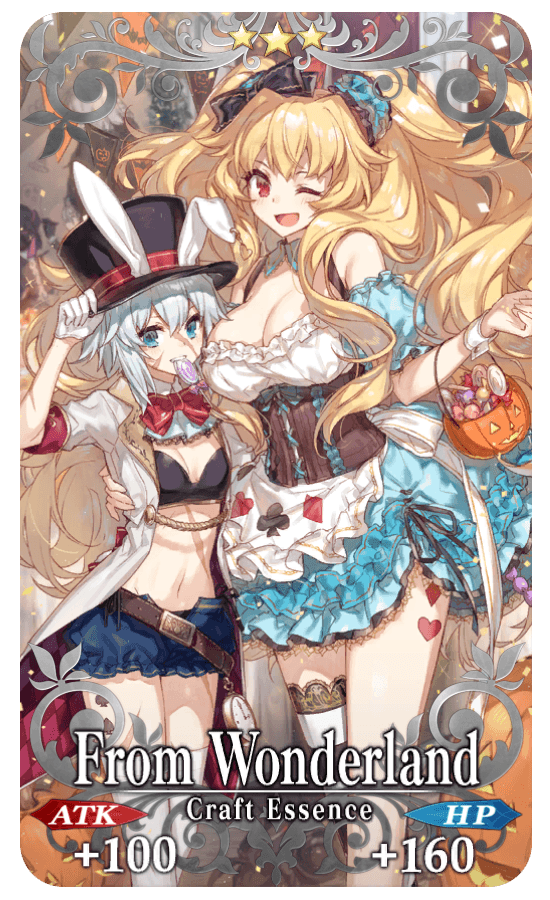 ★★★R From Wonderland ATK 100 (MAX: 500) HP 160 (MAX: 800) Skill Increase Quick Card & Buster Card effectiveness by 4% for yourself |