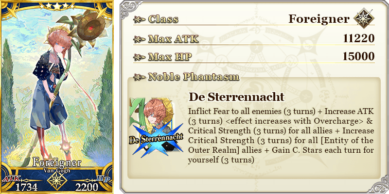 ★★★★★SSR Mystery Treasure ATK 250 (MAX: 1000) HP 400 (MAX: 1600) Skill Increase Arts Card effectiveness by 8% & Buster Card effectiveness by 8% & Critical Strength by 8% & begin battle with NP charged at 40% for yourself + Increase Void Space Toro amount per drop by 1 [Event Only]