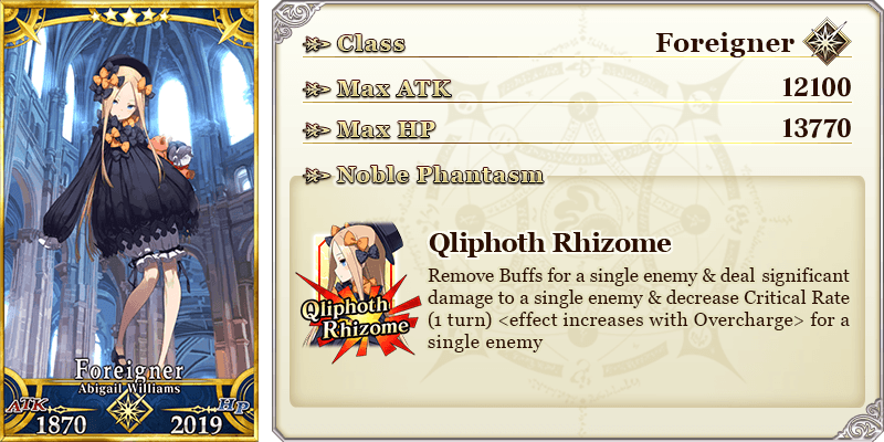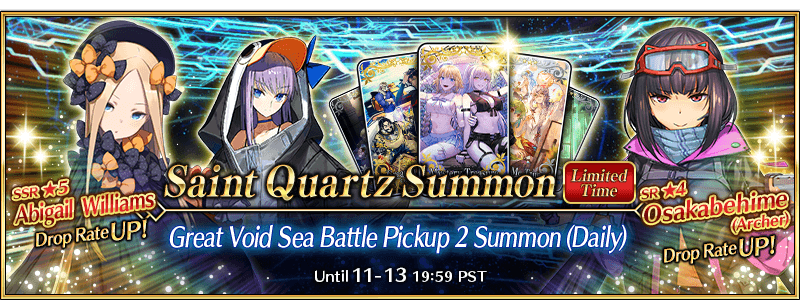 | 2022-11-03 21:00 - 11-04 20:59 PDT (GMT -7) | ★5 Abigail Williams | ★4 Osakabehime (Archer) ★4 Mysterious Alter Ego Λ |