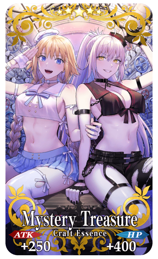 ★★★★★SSR Mystery Treasure ATK 250 (MAX: 1000) HP 400 (MAX: 1600) Skill Increase Arts Card effectiveness by 8% & Buster Card effectiveness by 8% & Critical Strength by 8% & begin battle with NP charged at 40% for yourself + Increase Void Space Toro amount per drop by 1 [Event Only]