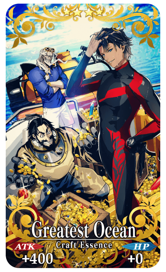 ★★★★SR Greatest Ocean ATK 400 (MAX: 1500) HP 0 Skill Increase Arts Card effectiveness by 3% & NP Strength by 5% & increase NP Charge by 1 level when using NP (1 time) for yourself + Increase Void Space Uni amount per drop by 1 [Event Only]