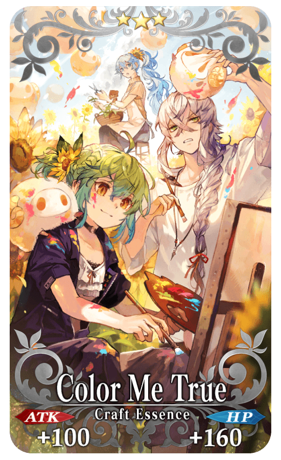 ★★★R Color Me True ATK 100 (MAX: 500) HP 160 (MAX: 800) Skill Apply Sure Hit & increase NP Gain by 5% for yourself + Increase Void Space Calamari amount per drop by 1 [Event Only]