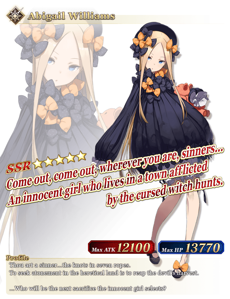 | 2022-11-03 21:00 - 11-04 20:59 PDT (GMT -7) | ★5 Abigail Williams | ★4 Osakabehime (Archer) ★4 Mysterious Alter Ego Λ |