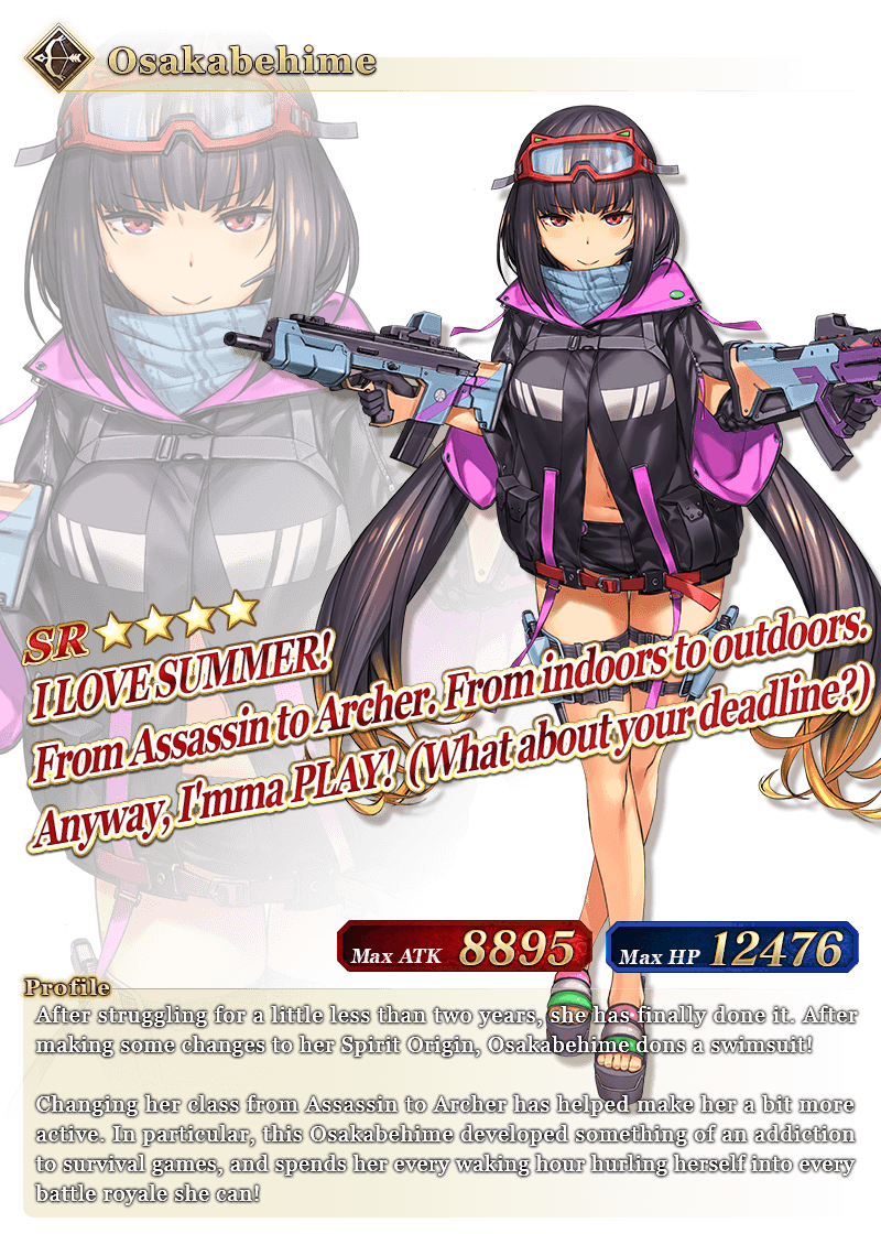 | 2022-11-09 20:00 - 11-10 19:59 PST (GMT -8) | ★4 Osakabehime (Archer) ★4 Mysterious Alter Ego Λ |