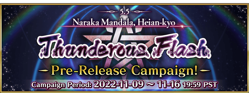 To go along with Part 2 Chapter 5.5 "Naraka Mandala, Heian-kyo - Thunderous Flash" scheduled to release in late November 2022, we will be holding the "'Naraka Mandala, Heian-kyo - Thunderous Flash' Pre-Release Campaign"!