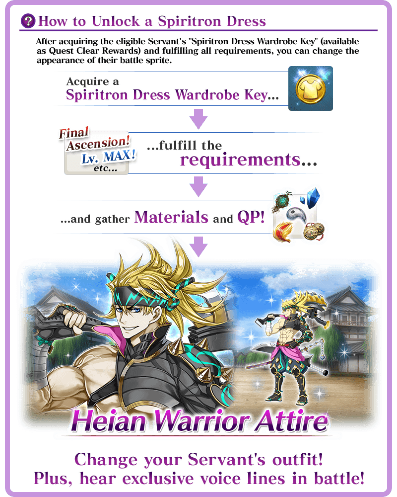 * Upon unlocking a Spiritron Dress, the Servant's battle sprite and icons will automatically be changed. You can revert back to the original appearance or change to a different Ascension level from the Servant Details screen.