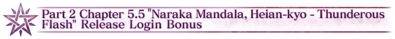 Since you were able to achieve 25,000 total reactions in the "Part 2 Chapter 5.5 'Naraka Mandala, Heian-kyo - Thunderous Flash' Release SNS Campaign", we'll be distributing a special login bonus! Log in during the period below to receive six Saint Quartz.