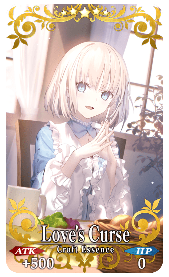★★★★★SSR Love's Curse ATK 500 (MAX: 2000) HP 0 Skill Begin battle with NP charged at 40% & increase NP Charge by 2 levels when using NP (1 time) & increase Debuff Success Rate by 10% for yourself |