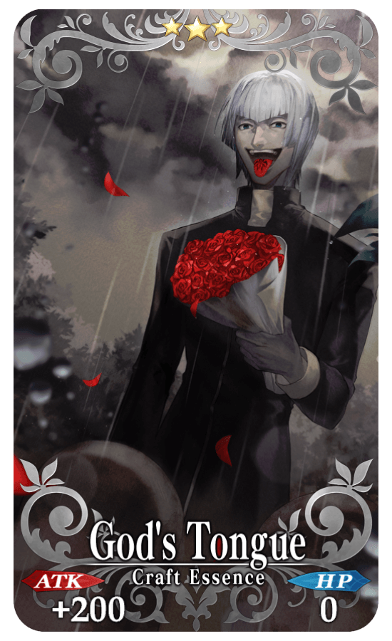 ★★★R God's Tongue ATK 200 (MAX: 1000) HP 0 Skill Increase Buster Card effectiveness by 5% & increase Debuff Resistance by 10% for yourself |