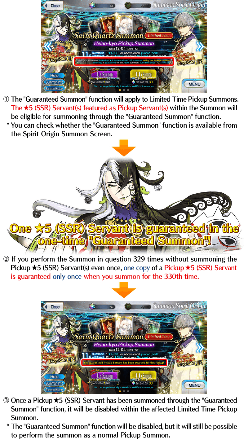 - In the case that you perform a Limited Time Pickup Summon 329 times without summoning the Pickup ★5 (SSR) Servant even once, the 330th time you perform the summon is guaranteed to be one copy of the Pickup ★5 (SSR) Servant one time only.