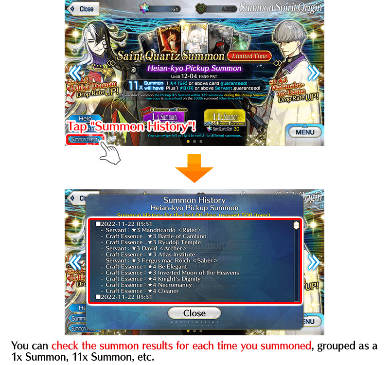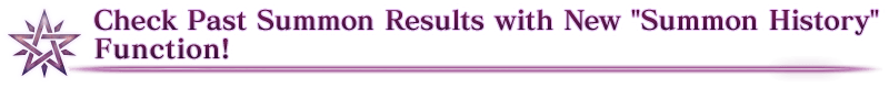 * The Summon History dialogue is displayed separately for each Summon. * Please note that it will not be possible to check your Summon History for a Limited Time Summon once that Summon has ended. * A maximum of 500 items will be displayed for each Summon's history. Only in the case that you perform an 11x Summon that takes you over the maximum number of items, more than 500 items can be displayed.
