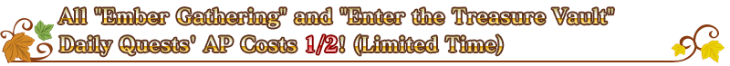 For a limited time, "Ember Gathering" and "Enter the Treasure Vault" Daily Quests (available within Chaldea Gate) will have their AP costs halved! (AP costs do not change even if you withdraw from battle)