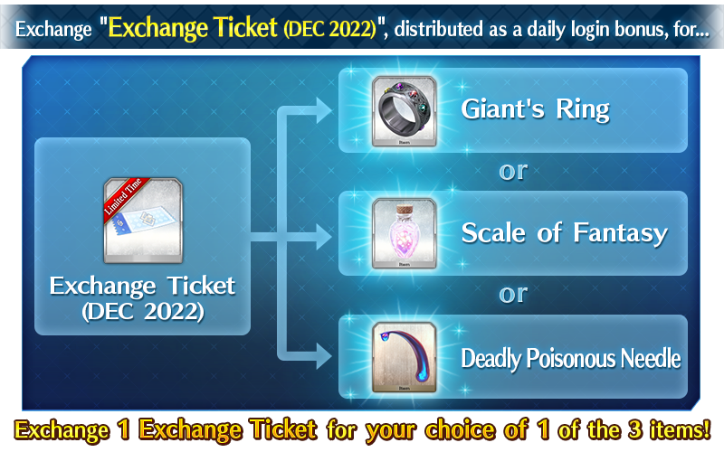 The "Exchange Ticket (DEC 2022)" distributed as a daily login bonus will be exchangeable for the following items.