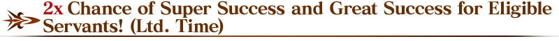 For the following period, when Enhancing the seven Servants with new Interludes, chances of a Super Success (double EXP) and Great Success (triple EXP) will be doubled for a limited time! Take advantage of this opportunity to Enhance your Servants!
