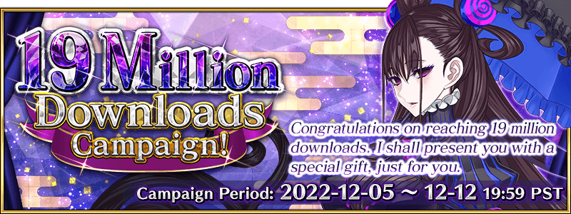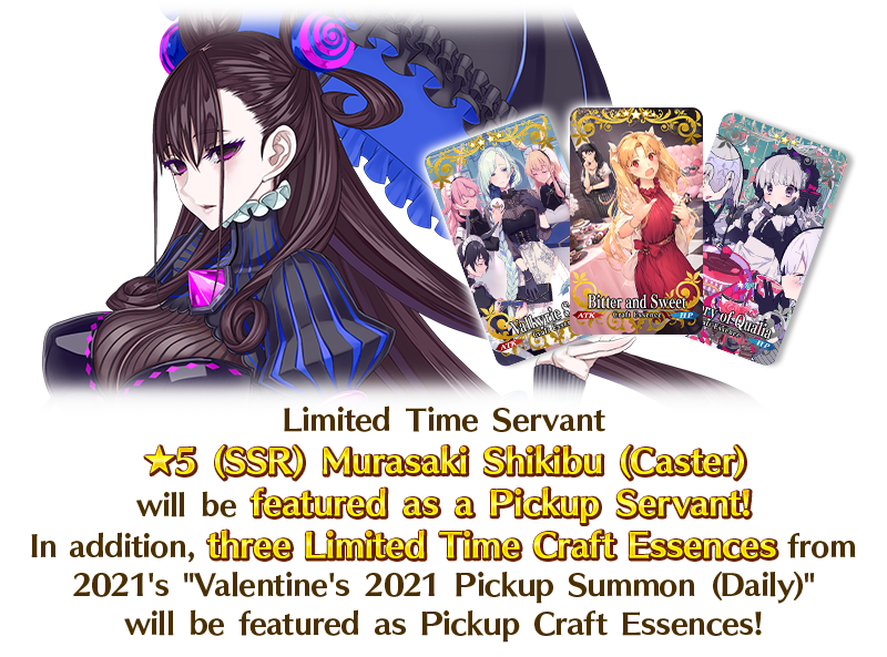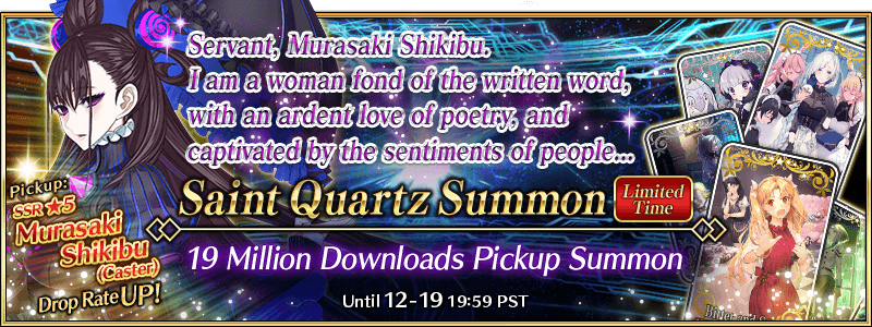 To celebrate over 19 million total downloads, Limited Time Servant "★5 (SSR) Murasaki Shikibu (Caster)" and three Limited Time Craft Essences from 2021's "Valentine's 2021 Pickup Summon (Daily)" will be featured as Pickup Servants and Pickup Craft Essences!