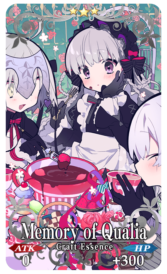 ★★★R Memory of Qualia ATK 0 HP 300 (MAX: 1500) Skill Gain 1 C. Star each turn & increase NP Gain by 3% & increase Critical Strength by 3% for yourself |