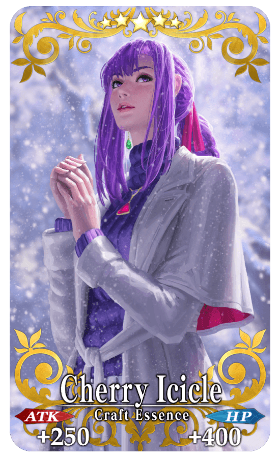 ★★★★★SSR Cherry Icicle ATK 250 (MAX: 1000) HP 400 (MAX: 1600) Skill Increase Quick Card effectiveness by 5% & NP Strength by 10% & begin battle with NP charged at 30% for yourself + Increase Solar Hand Wrap amount per drop by 1 [Event Only]