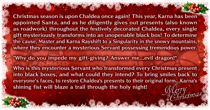 Christmas Season has again come to Chaldea! However, a mysterious phenomenon has caused all of the presents handed out inside Chaldea to turn black and refuse to open.