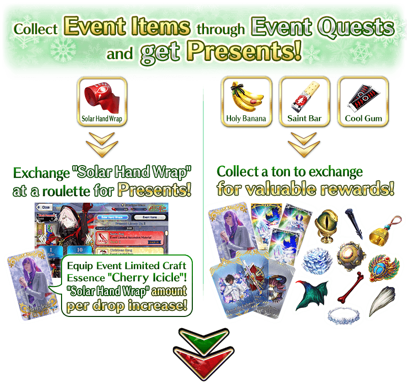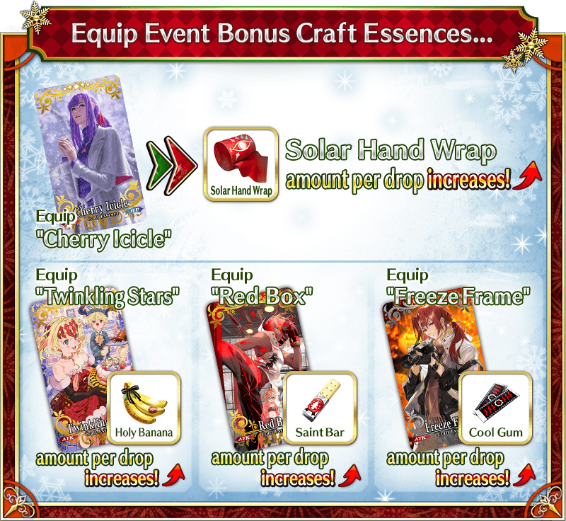 Equip the Limited Time Craft Essences "★5 (SSR) Twinkling Stars", "★4 (SR) Red Box", and "★3 (R) Freeze Frame", available through the ongoing Saint Quartz Summon, to receive a bonus to the amount per drop of event items "Holy Banana", "Saint Bar", and "Cool Gum".