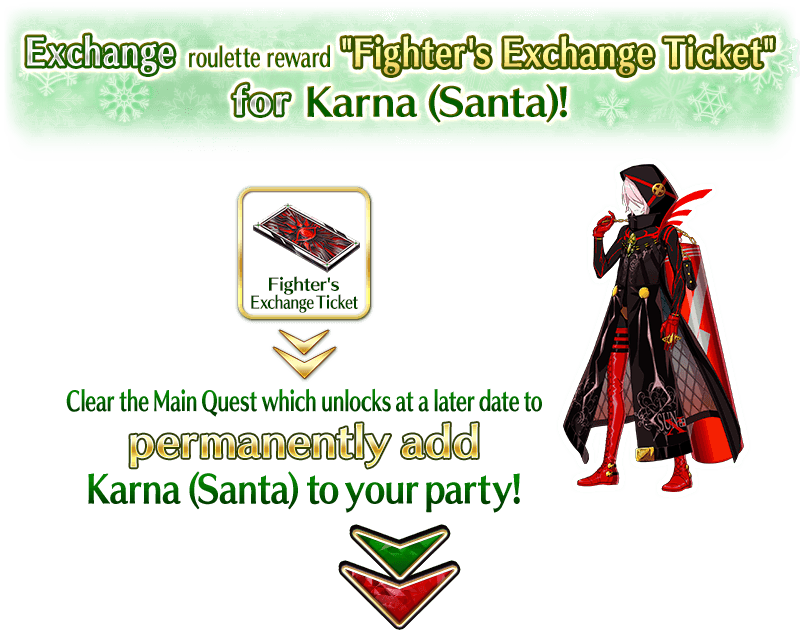 * Fighter's Exchange Ticket can be used to exchange for "★4 (SR) Karna (Santa)" after clearing the Epilogue of this event.