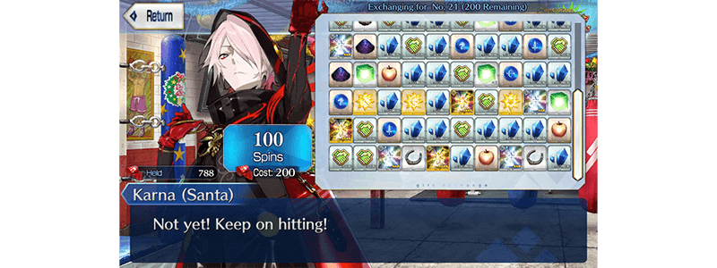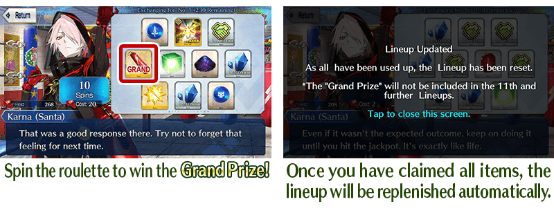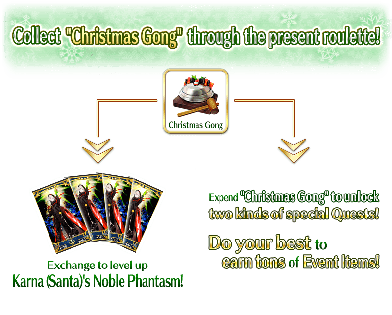 * In this event, the "Prize Reset" button will only appear once all prizes have been claimed. * Starting with the 11th Lineup, Grand Prizes and "Golden Fruit" and "Silver Fruit" will be removed from the lineup. * Starting from the 21st Lineup, "Black Present" will be removed from the lineup. * "Christmas Gong", an Event Item available in the prize roulette, can be used to exchange for "Karna (Santa) [For Noble Phantasm Enhancement]" and other materials, as well as to unlock special quests. * All "Solar Hand Wrap" will disappear at the end of the exchange period.