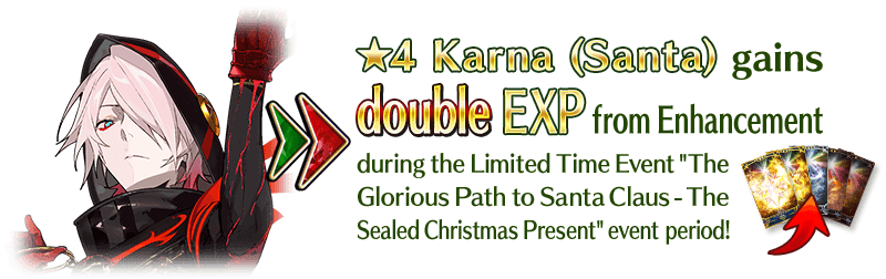 For the duration of the event period, "★4 (SR) Karna (Santa)" will receive double EXP when performing Enhancement.