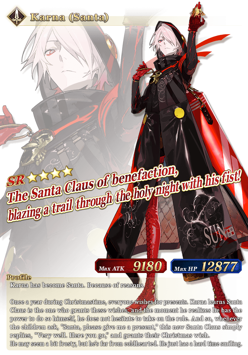 * The battle sprite for "★4 (SR) Karna (Santa)" will not change with Ascension level.