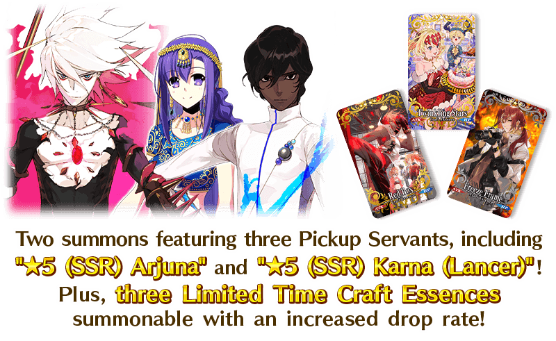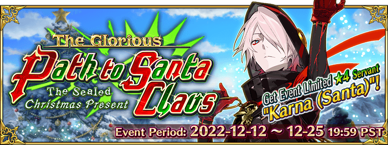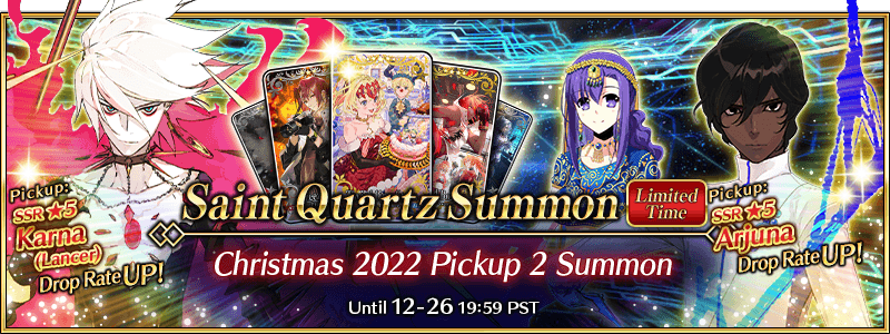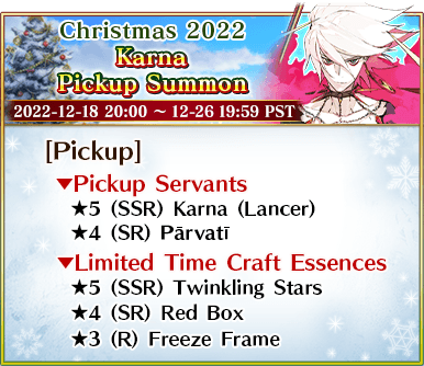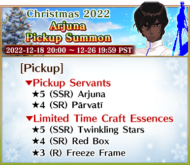 Three Servants related to the Limited Time Event "The Glorious Path to Santa Claus - The Sealed Christmas Present", including "★5 (SSR) Arjuna" and "★5 (SSR) Karna (Lancer)", and three Limited Time Craft Essences will be featured as Pickup Servants and Pickup Craft Essences!