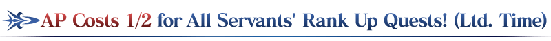 During the campaign period, Rank Up Quests for all Servants will have 1/2 AP costs!