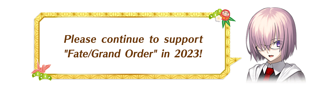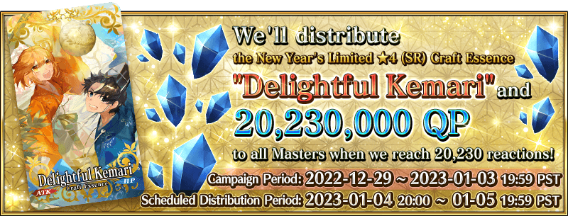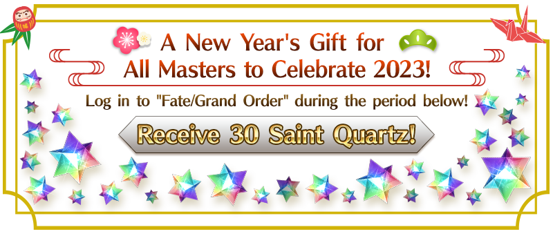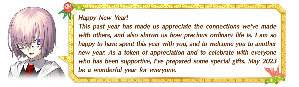 * New Masters must clear "Singularity F: Flame Contaminated City, Fuyuki - Section 3, Part 1" by the end of the Distribution Period at 2023-01-05 19:59 PST (GMT -8) to receive the presents.